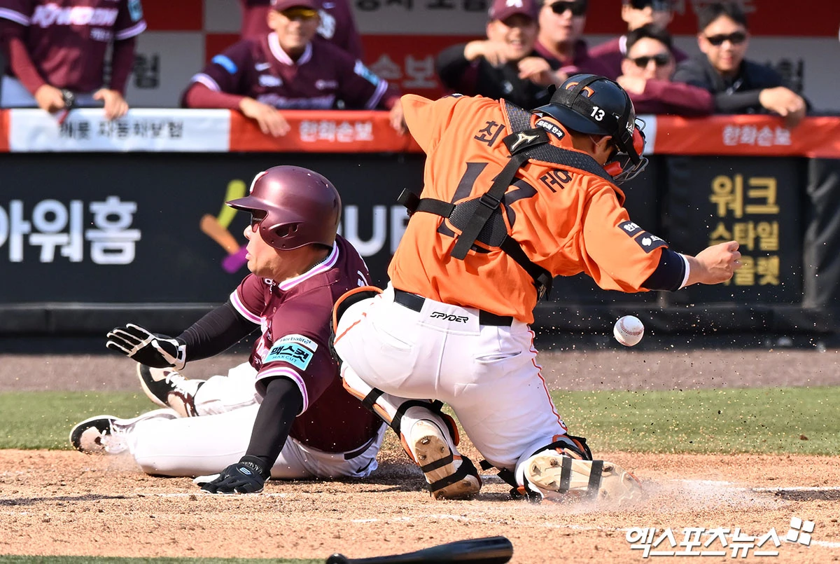 (엑스포츠뉴스 대전, 김한준 기자) 28일 오후 대전 한화생명 볼파크에서 열린 '2026 신한 SOL Bank KBO리그' 키움 히어로즈와 한화 이글스의 개막전 경기, 5회초 2사 만루 키움 안치홍이 브룩스의 2타점 2루타때 오재원의 포구 실책을 틈타 득점에 성공하고 있다.