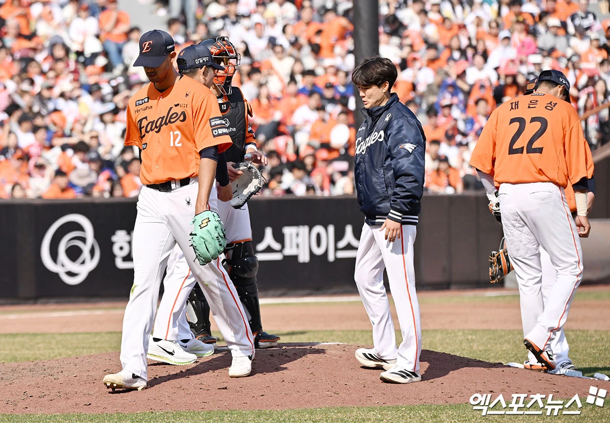(엑스포츠뉴스 대전, 김한준 기자) 28일 오후 대전 한화생명 볼파크에서 열린 '2026 신한 SOL Bank KBO리그' 키움 히어로즈와 한화 이글스의 개막전 경기, 5회초 2사 2루 한화 에르난데스가 마운드를 내려오고 있다.