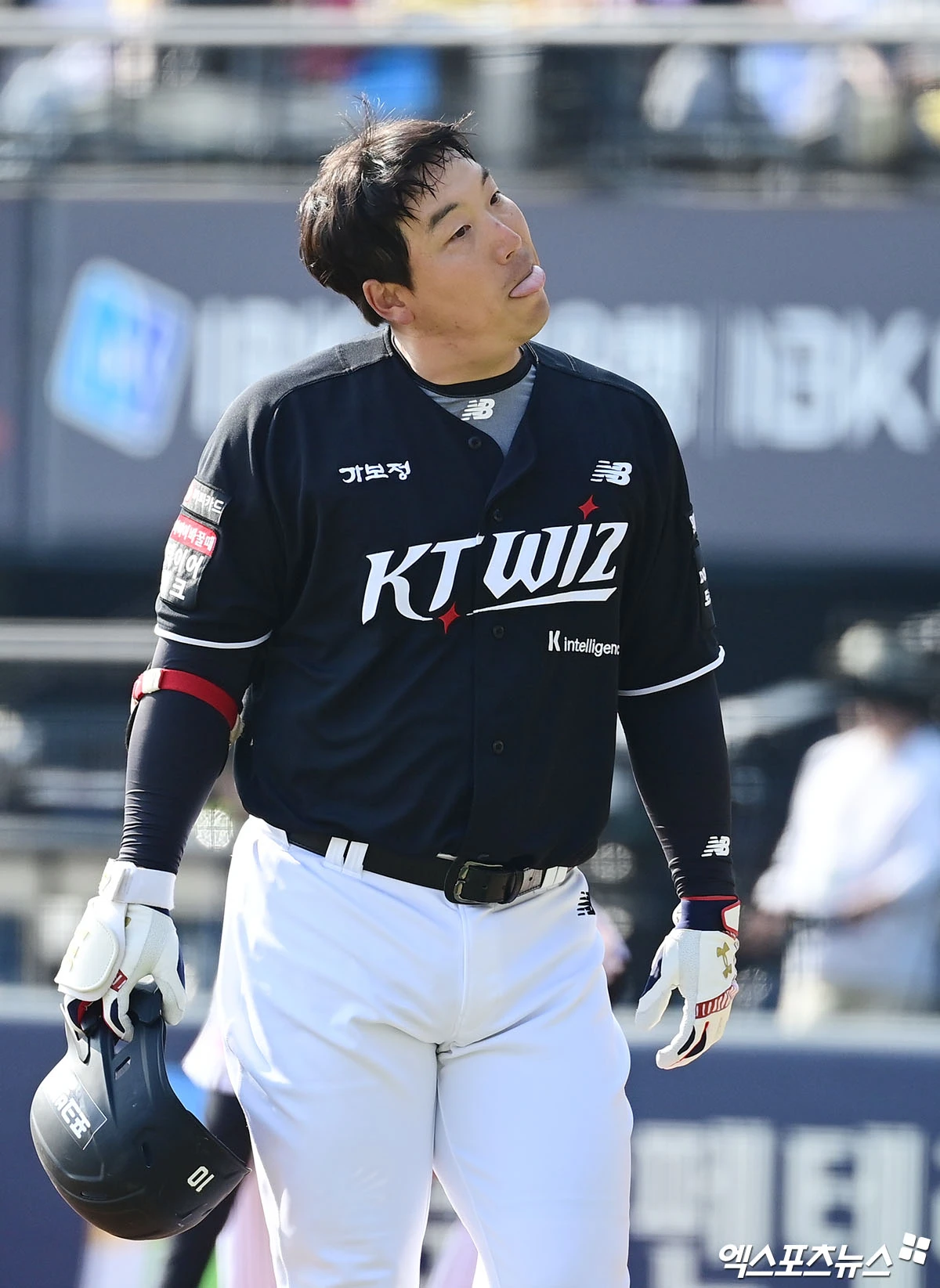 (엑스포츠뉴스 잠실, 박지영 기자) 28일 오후 서울 송파구 잠실야구장에서 열린 '2026 신한 SOL Bank KBO리그' KT 위즈와 LG 트윈스의 경기, 5회초 1사 1루 KT 김현수가 좌익수 라인드라이브 아웃으로 물러나며 아쉬워하고 있다.