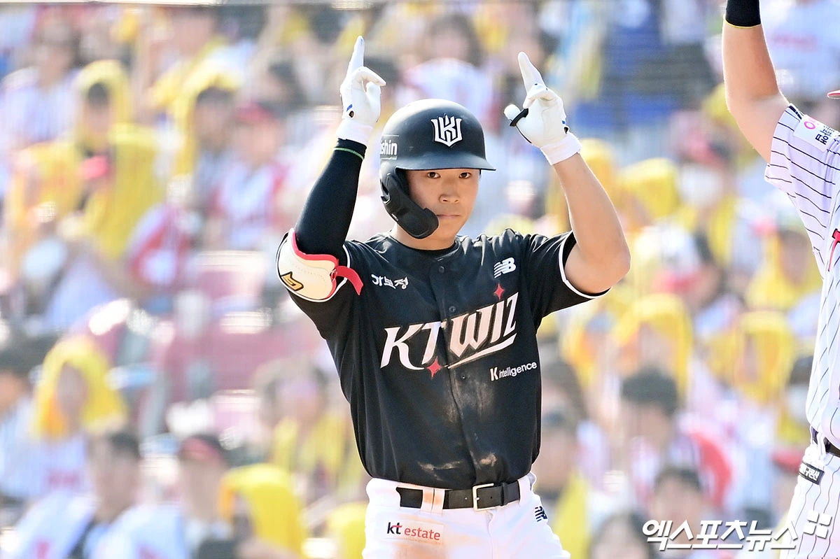 (엑스포츠뉴스 잠실, 박지영 기자) 28일 오후 서울 송파구 잠실야구장에서 열린 '2026 신한 SOL Bank KBO리그' KT 위즈와 LG 트윈스의 경기, 6회초 1사 KT 류현인이 안타를 때려낸 뒤 세리머니를 하고 있다.