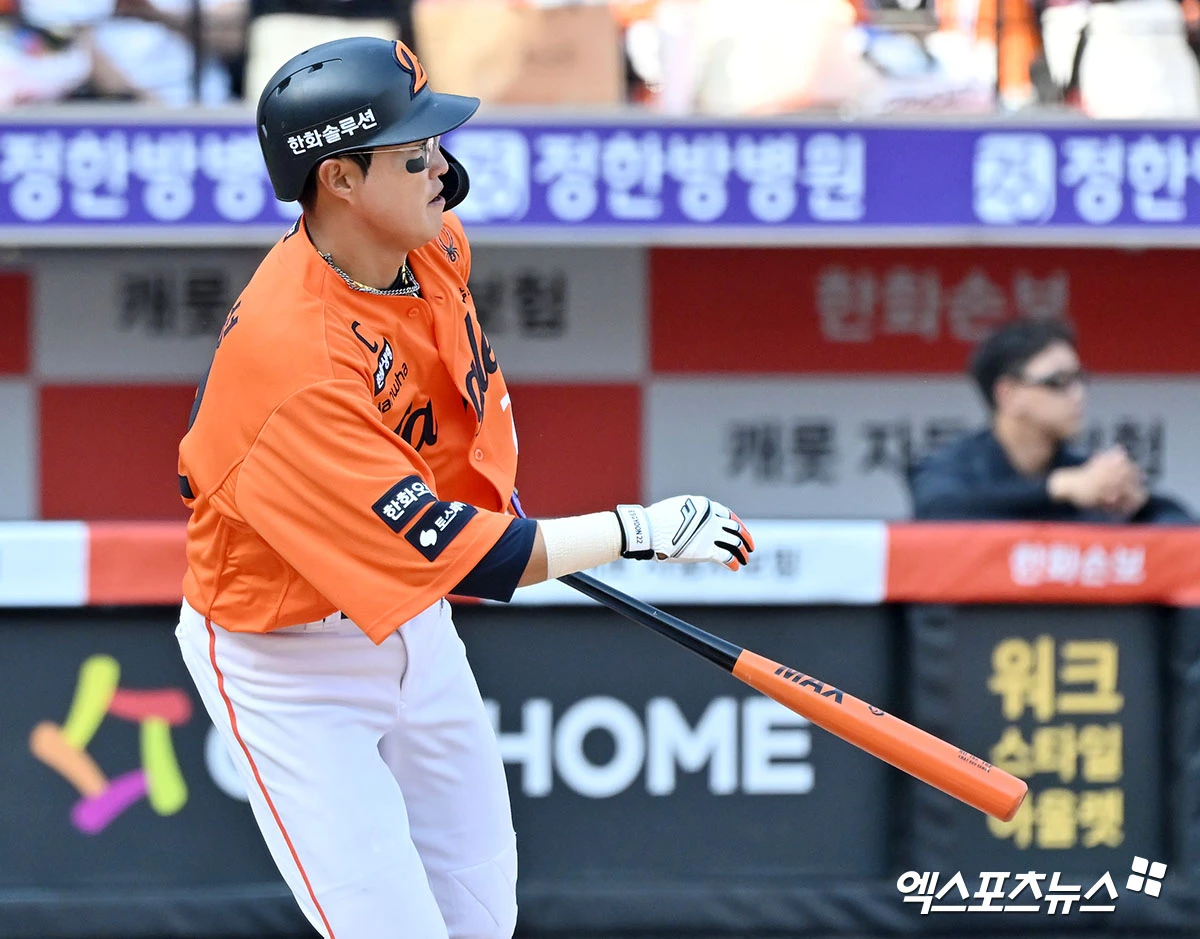 ㅊ(엑스포츠뉴스 대전, 김한준 기자) 28일 오후 대전 한화생명 볼파크에서 열린 '2026 신한 SOL Bank KBO리그' 키움 히어로즈와 한화 이글스의 개막전 경기, 6회말 1사 한화 채은성이 좌전안타를 날리고 있다.