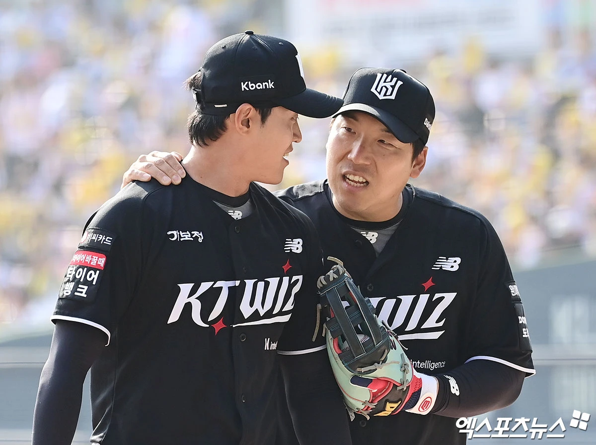 (엑스포츠뉴스 잠실, 박지영 기자) 28일 오후 서울 송파구 잠실야구장에서 열린 '2026 신한 SOL Bank KBO리그' KT 위즈와 LG 트윈스의 경기, 6회말 종료 후 KT 투수 전용주가 더그아웃으로 향하며 김현수와 이야기를 나누고 있다.
