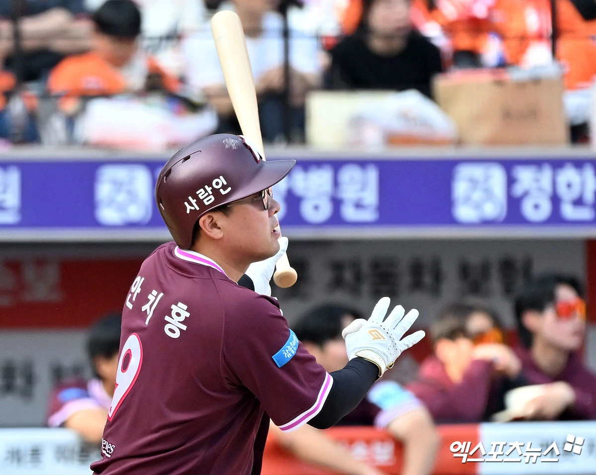 ㅊ(엑스포츠뉴스 대전, 김한준 기자) 28일 오후 대전 한화생명 볼파크에서 열린 '2026 신한 SOL Bank KBO리그' 키움 히어로즈와 한화 이글스의 개막전 경기, 7회초 1사 1루 키움 안치홍이 2루타를 날리고 있다.
