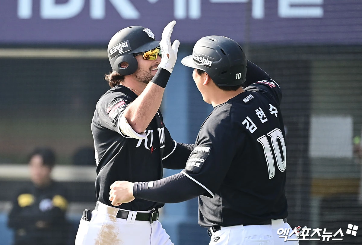 (엑스포츠뉴스 잠실, 박지영 기자) 28일 오후 서울 송파구 잠실야구장에서 열린 '2026 신한 SOL Bank KBO리그' KT 위즈와 LG 트윈스의 경기, 7회초 2사 2루 KT 힐리어드가 LG 투수 백승현 상대로 투런 홈런을 때려낸 뒤 홈에서 김현수와 하이파이브를 나누고 있다.