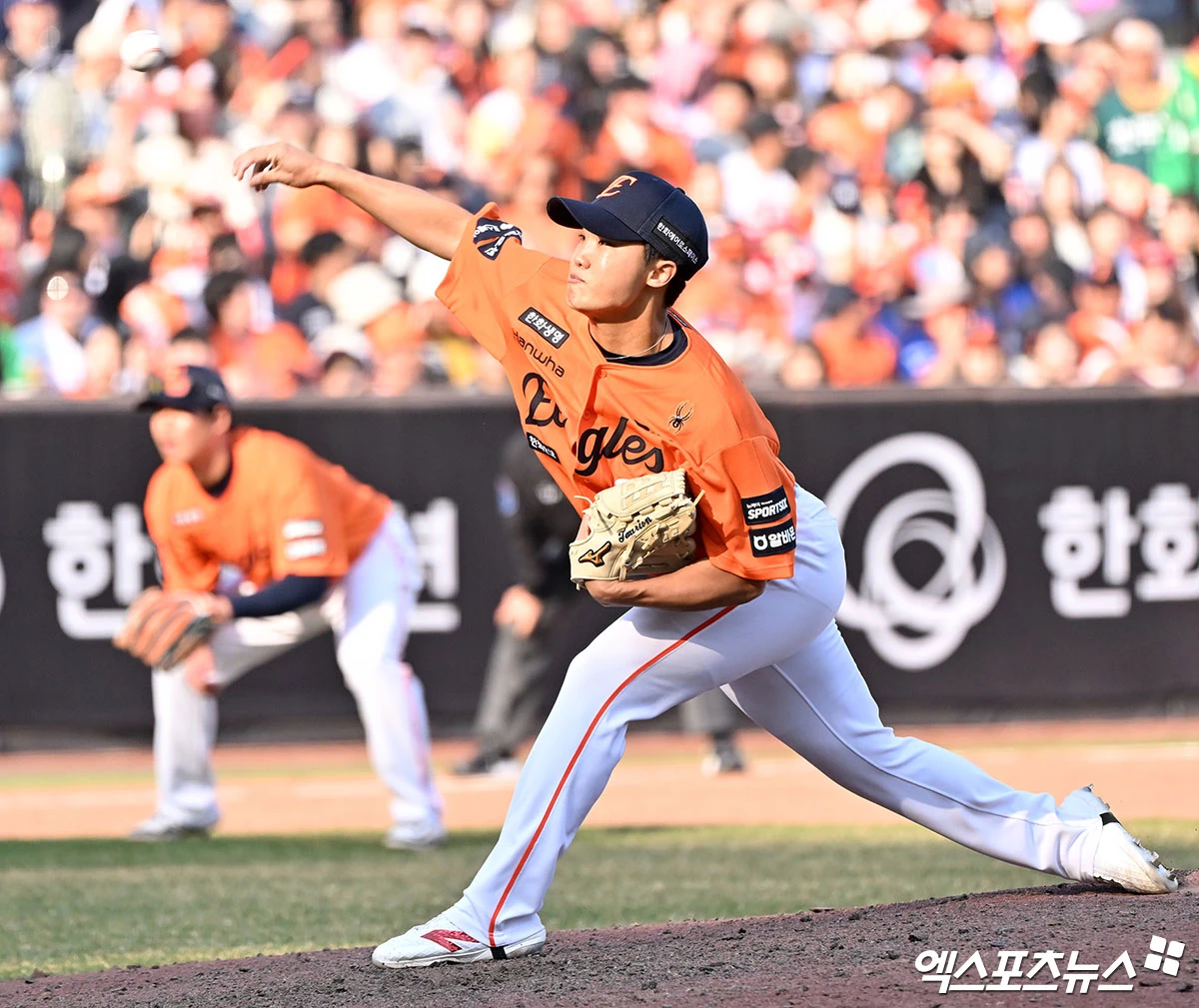 (엑스포츠뉴스 대전, 김한준 기자) 28일 오후 대전 한화생명 볼파크에서 열린 '2026 신한 SOL Bank KBO리그' 키움 히어로즈와 한화 이글스의 개막전 경기, 8회초 한화 정우주가 공을 힘차게 던지고 있다.