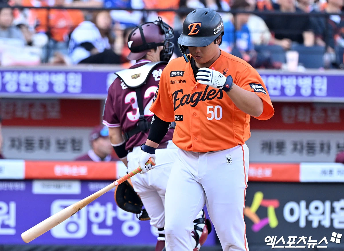 (엑스포츠뉴스 대전, 김한준 기자) 28일 오후 대전 한화생명 볼파크에서 열린 '2026 신한 SOL Bank KBO리그' 키움 히어로즈와 한화 이글스의 개막전 경기, 8회말 한화 강백호가 헛스윙 삼진을 당하고 있다.