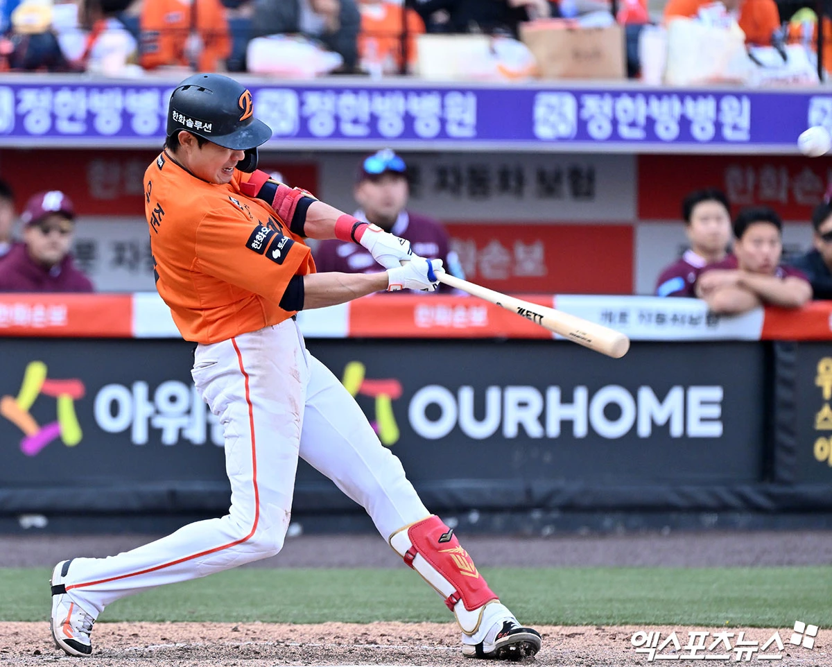 (엑스포츠뉴스 대전, 김한준 기자) 28일 오후 대전 한화생명 볼파크에서 열린 '2026 신한 SOL Bank KBO리그' 키움 히어로즈와 한화 이글스의 개막전 경기, 8회말 2사 1,2루 한화 심우준이 동점 스리런 홈런을 날리고 있다.