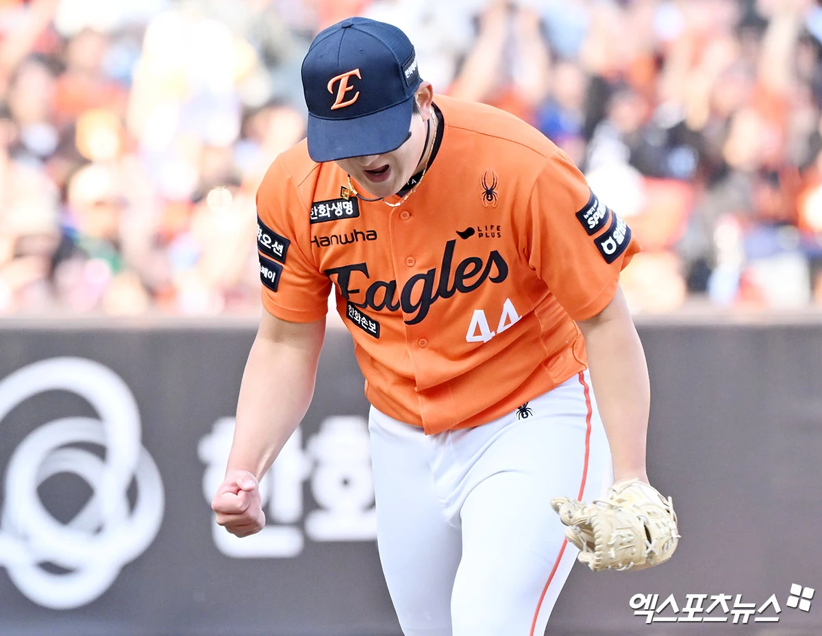 (엑스포츠뉴스 대전, 김한준 기자) 28일 오후 대전 한화생명 볼파크에서 열린 '2026 신한 SOL Bank KBO리그' 키움 히어로즈와 한화 이글스의 개막전 경기, 9회초 수비를 마친 한화 김서현이 포효하고 있다.