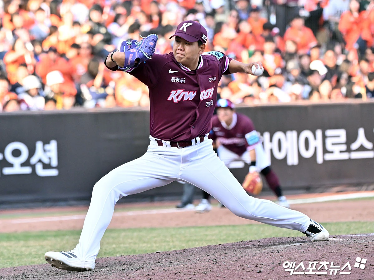 (엑스포츠뉴스 대전, 김한준 기자) 28일 오후 대전 한화생명 볼파크에서 열린 '2026 신한 SOL Bank KBO리그' 키움 히어로즈와 한화 이글스의 개막전 경기, 9회말 키움 박정훈이 공을 힘차게 던지고 있다.