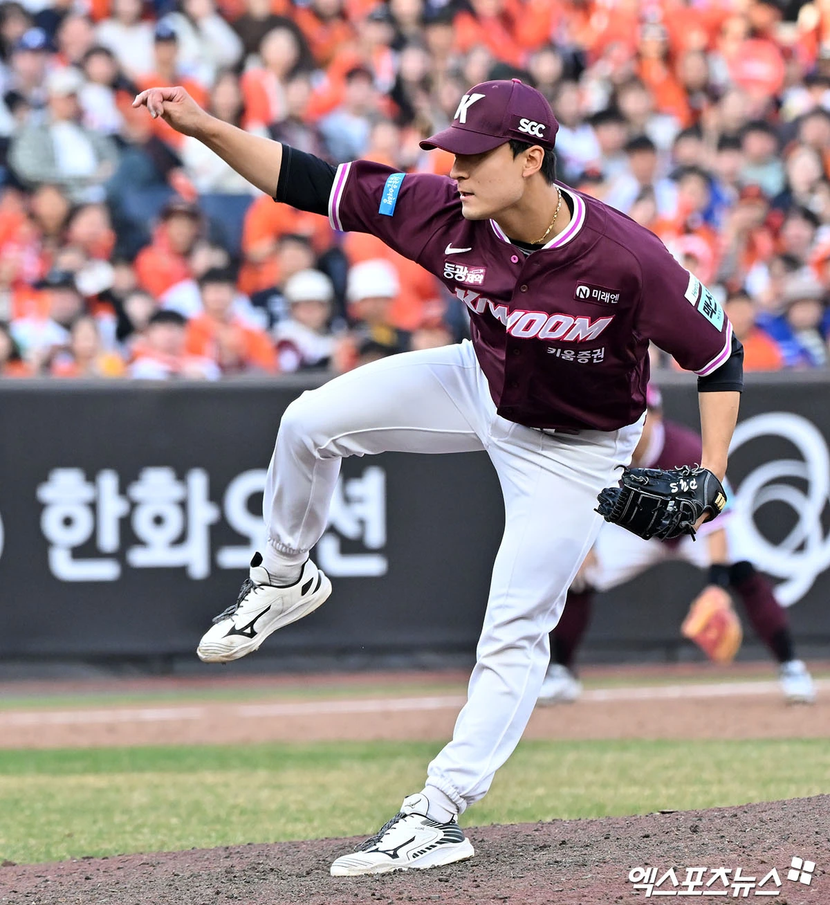 (엑스포츠뉴스 대전, 김한준 기자) 28일 오후 대전 한화생명 볼파크에서 열린 '2026 신한 SOL Bank KBO리그' 키움 히어로즈와 한화 이글스의 개막전 경기, 10회말 키움 박윤성이 공을 힘차게 던지고 있다.