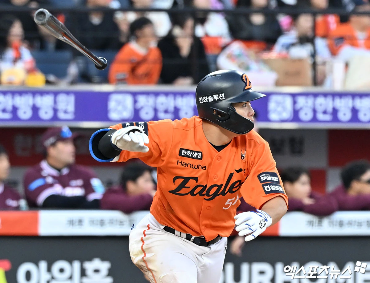 (엑스포츠뉴스 대전, 김한준 기자) 28일 오후 대전 한화생명 볼파크에서 열린 '2026 신한 SOL Bank KBO리그' 키움 히어로즈와 한화 이글스의 개막전 경기, 11회말 2사 1루 한화 문현빈이 1타점 2루타를 날리고 있다.