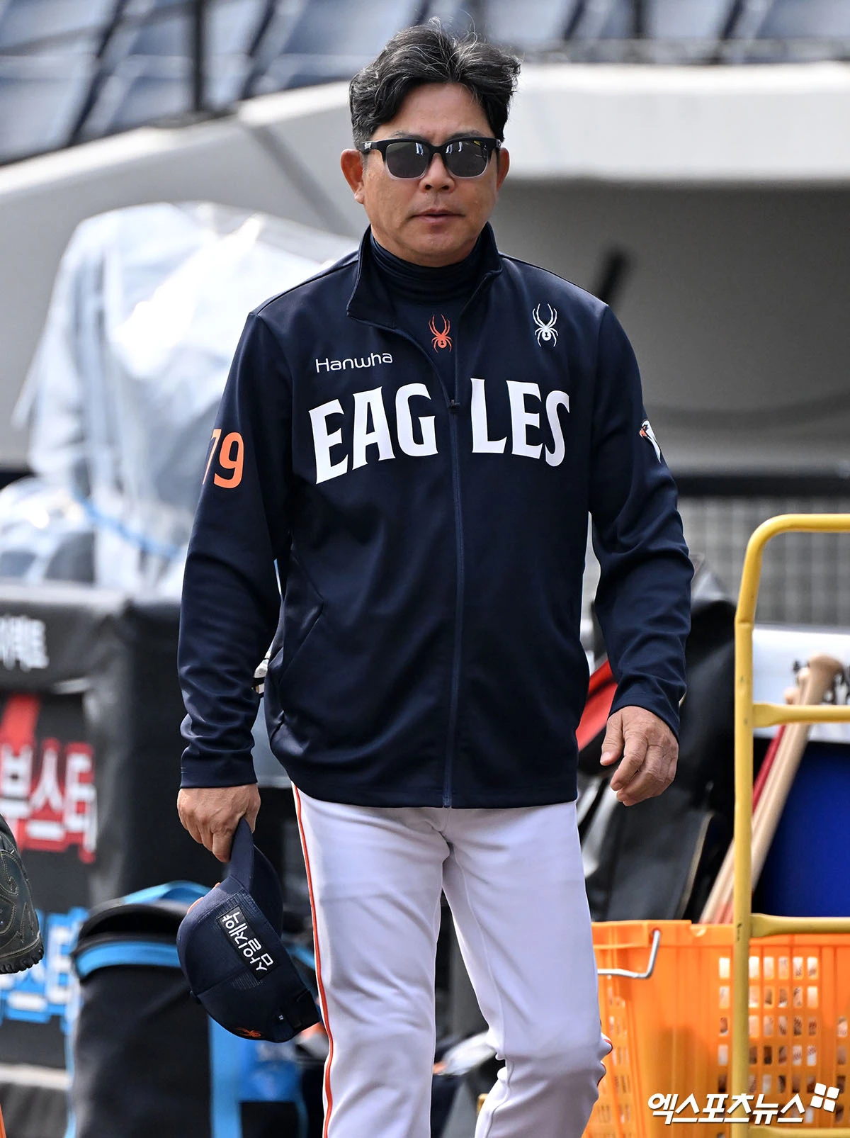 (엑스포츠뉴스 대전, 김한준 기자) 29일 오후 대전 한화생명 볼파크에서 열리는 '2026 신한 SOL Bank KBO리그' 키움 히어로즈와 한화 이글스의 경기, 한화 양상문 투수코치가 그라운드로 나오고 있다.