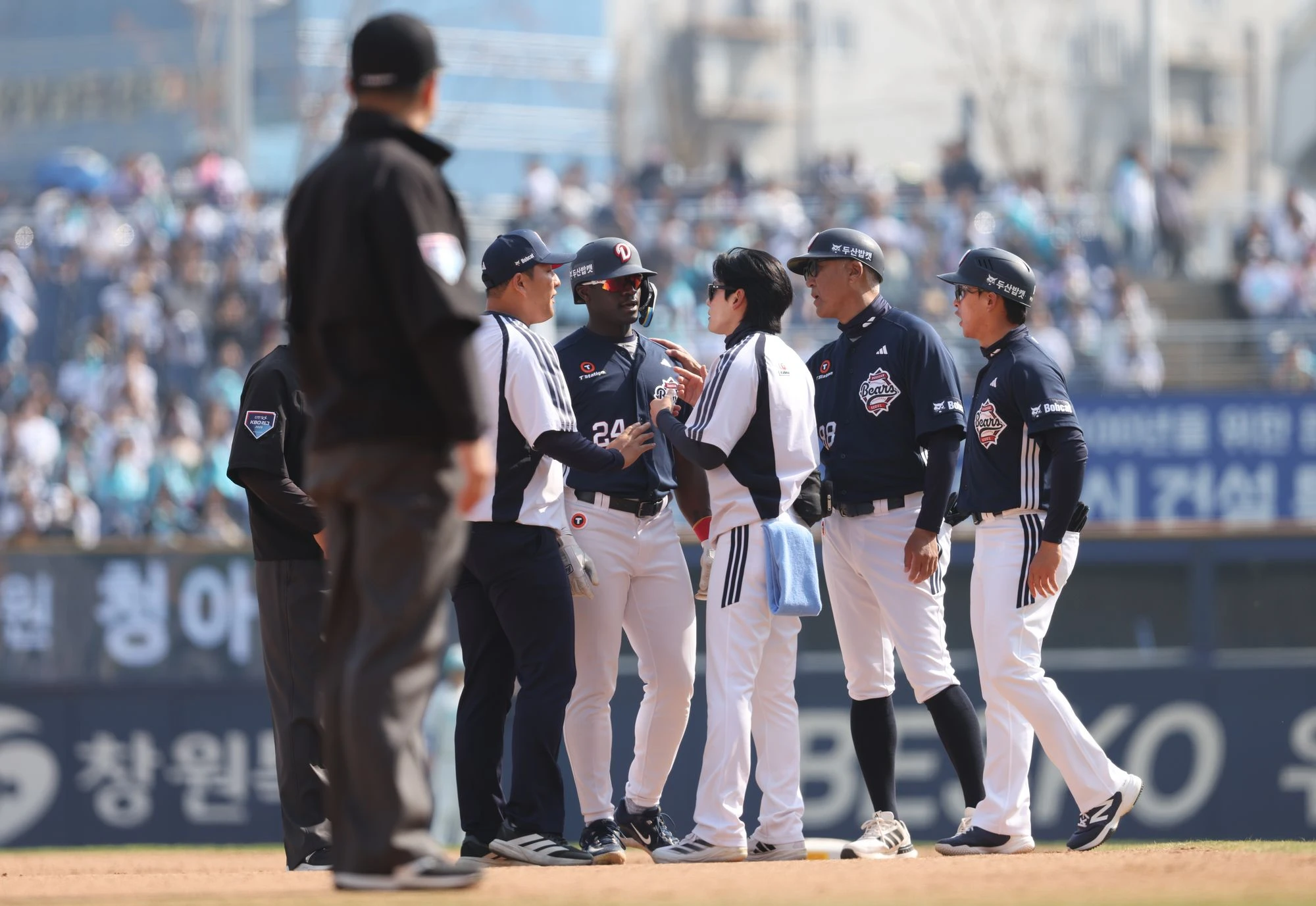 지난 28일 주루 도중 햄스트링 불편함을 느껴 교체된 카메론이 선발 리언업에서 빠졌다. 그는 4회초 두 번째 타석에서 좌익수 키를 넘기는 2루타를 치고 나갔다. 그러나 후속타자 양의지가 중견수 뜬공으로 물러난 뒤 강승호의 타석 때 갑자기 통증을 호소했고, 결국 대주자 김민석과 교체되며 트레이너의 부축을 받고 그라운드를 빠져나갔다.