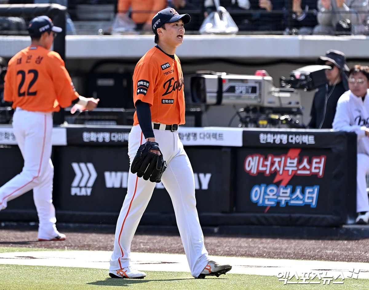 (엑스포츠뉴스 대전, 김한준 기자) 29일 오후 대전 한화생명 볼파크에서 열린 '2026 신한 SOL Bank KBO리그' 키움 히어로즈와 한화 이글스의 경기, 1회초 수비를 마친 한화 왕옌청이 더그아웃으로 향하고 있다.
