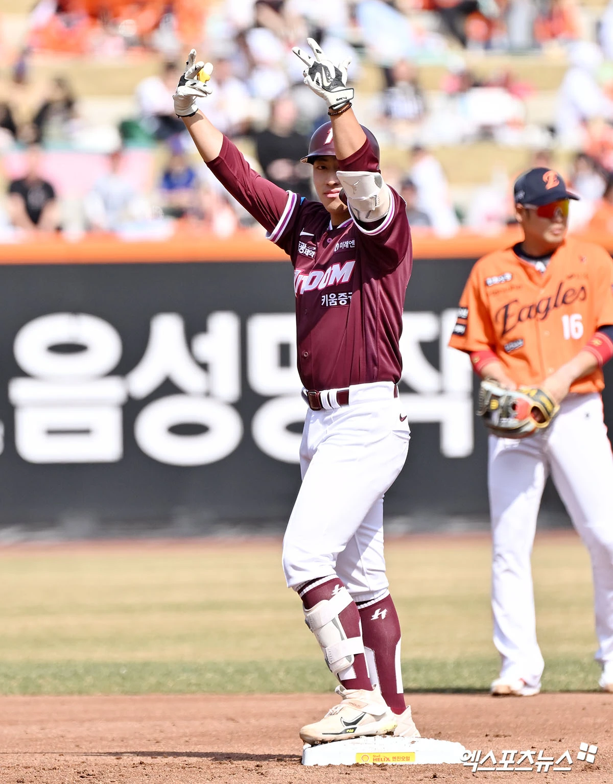(엑스포츠뉴스 대전, 김한준 기자) 29일 오후 대전 한화생명 볼파크에서 열린 '2026 신한 SOL Bank KBO리그' 키움 히어로즈와 한화 이글스의 경기, 2회초 2사 1,2루 키움 최재영이 2타점 2루타를 날리고 있다.