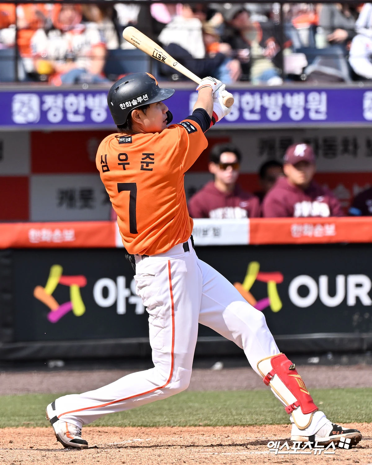 (엑스포츠뉴스 대전, 김한준 기자) 29일 오후 대전 한화생명 볼파크에서 열린 '2026 신한 SOL Bank KBO리그' 키움 히어로즈와 한화 이글스의 경기, 2회말 2사 1,3루 한화 심우준이 1타점 2루타를 날리고 있다.