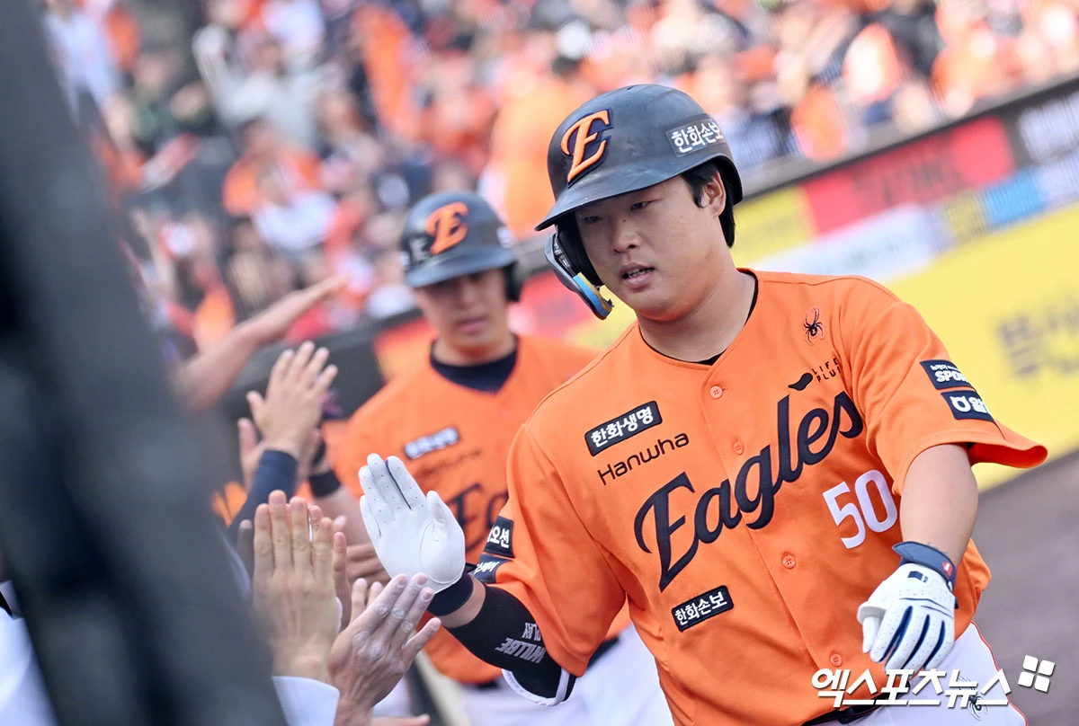 (엑스포츠뉴스 대전, 김한준 기자) 29일 오후 대전 한화생명 볼파크에서 열린 '2026 신한 SOL Bank KBO리그' 키움 히어로즈와 한화 이글스의 경기, 3회말 무사 1루 한화 강백호가 투런 홈런을 날린 후 기뻐하고 있다.