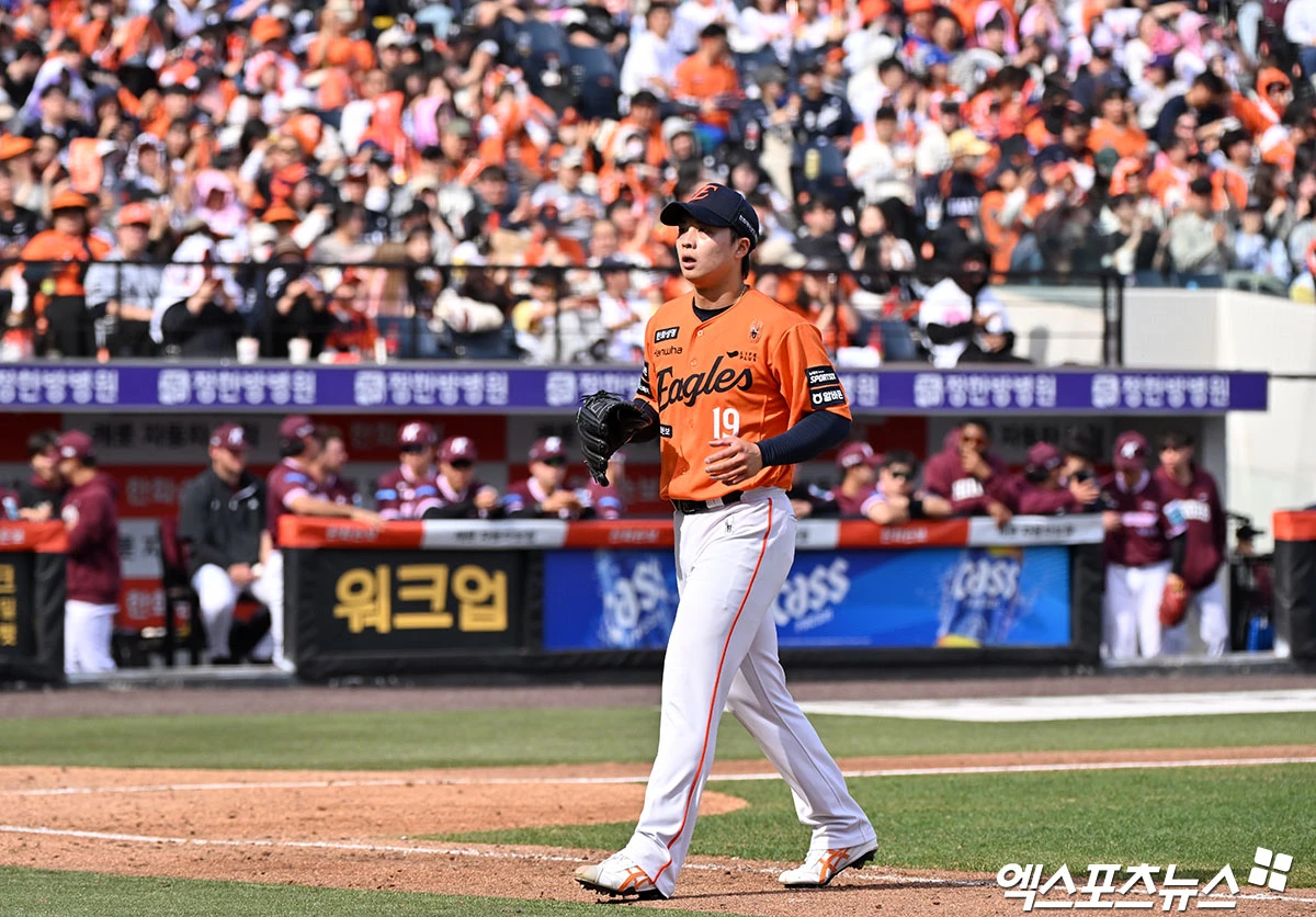 (엑스포츠뉴스 대전, 김한준 기자) 29일 오후 대전 한화생명 볼파크에서 열린 '2026 신한 SOL Bank KBO리그' 키움 히어로즈와 한화 이글스의 경기, 4회초 수비를 마친 한화 왕옌청이 더그아웃으로 향하고 있다.