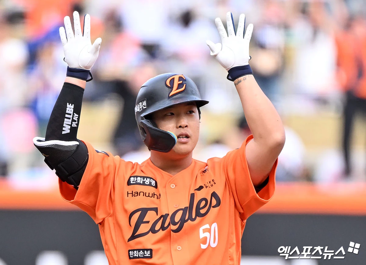 (엑스포츠뉴스 대전, 김한준 기자) 29일 오후 대전 한화생명 볼파크에서 열린 '2026 신한 SOL Bank KBO리그' 키움 히어로즈와 한화 이글스의 경기, 4회말 1사 만루 한화 강백호가 2타점 2루타를 날린 후 기뻐하고 있다.