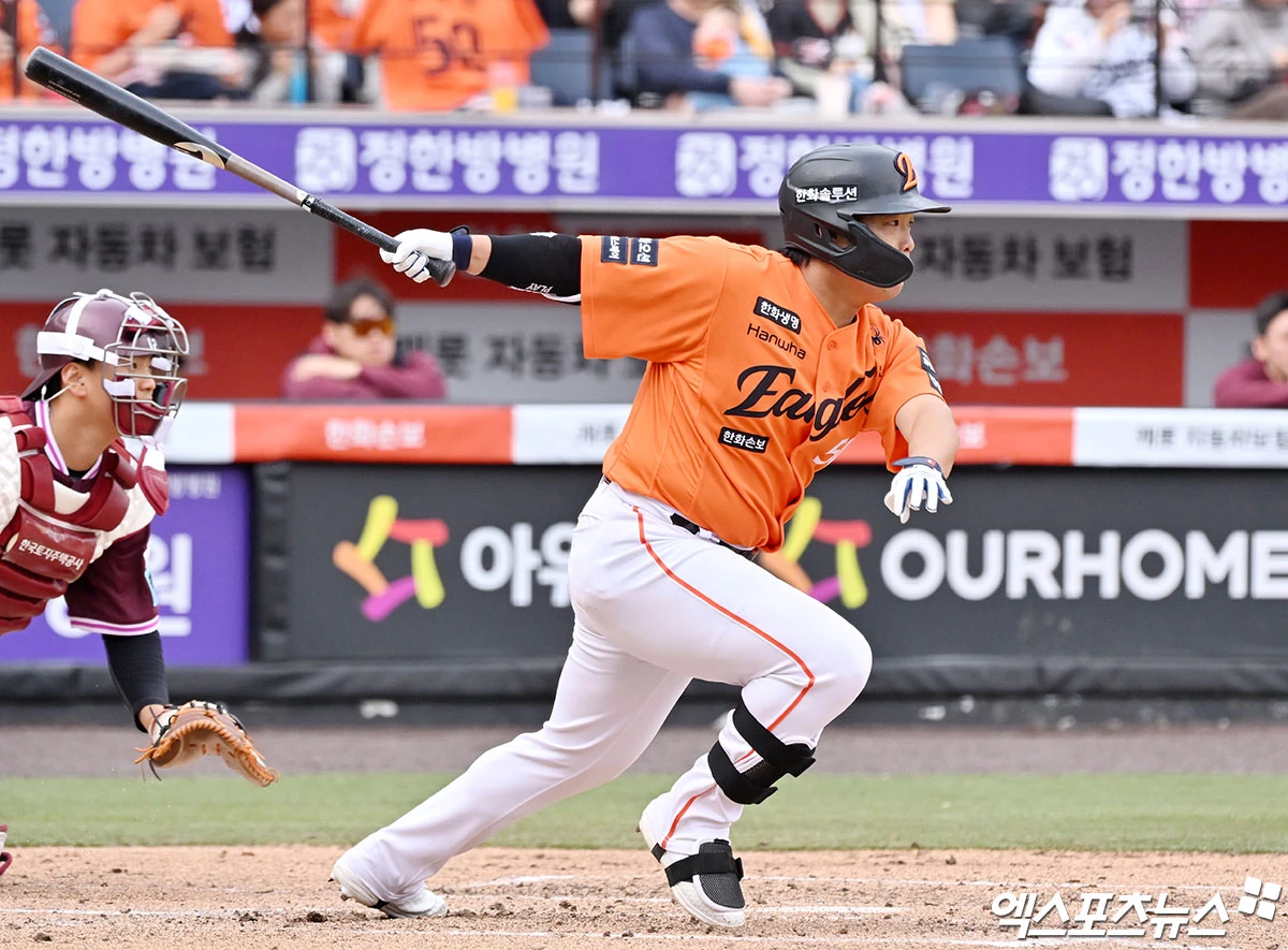 (엑스포츠뉴스 대전, 김한준 기자) 29일 오후 대전 한화생명 볼파크에서 열린 '2026 신한 SOL Bank KBO리그' 키움 히어로즈와 한화 이글스의 경기, 6회말 무사 만루 한화 강백호가 타격을 하고 있다.