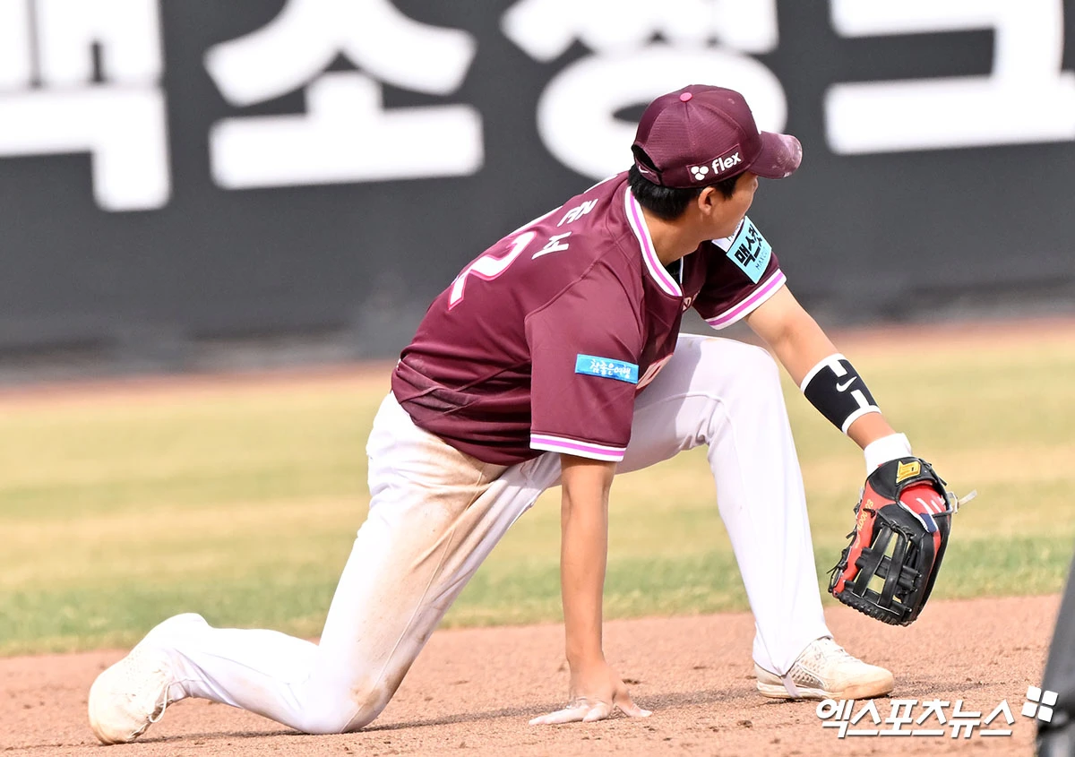 (엑스포츠뉴스 대전, 김한준 기자) 29일 오후 대전 한화생명 볼파크에서 열린 '2026 신한 SOL Bank KBO리그' 키움 히어로즈와 한화 이글스의 경기, 6회말 무사 만루 키움 어준서가 포구 실책을 하고 있다.