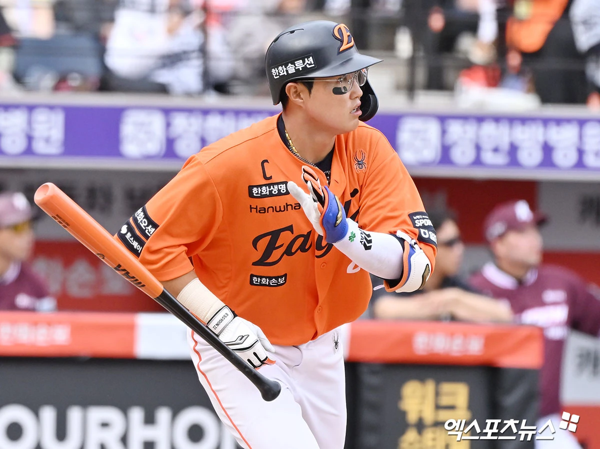 (엑스포츠뉴스 대전, 김한준 기자) 29일 오후 대전 한화생명 볼파크에서 열린 '2026 신한 SOL Bank KBO리그' 키움 히어로즈와 한화 이글스의 경기, 6회말 무사 1,3 한화 채은성이 1타점 희생플라이 타구를 날리고 있다.