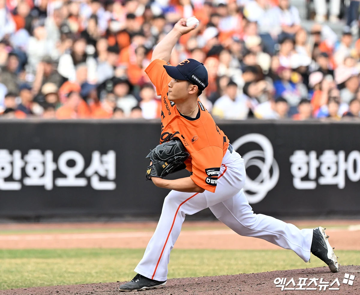 (엑스포츠뉴스 대전, 김한준 기자) 29일 오후 대전 한화생명 볼파크에서 열린 '2026 신한 SOL Bank KBO리그' 키움 히어로즈와 한화 이글스의 경기, 7회초 한화 윤산흠이 공을 힘차게 던지고 있다.