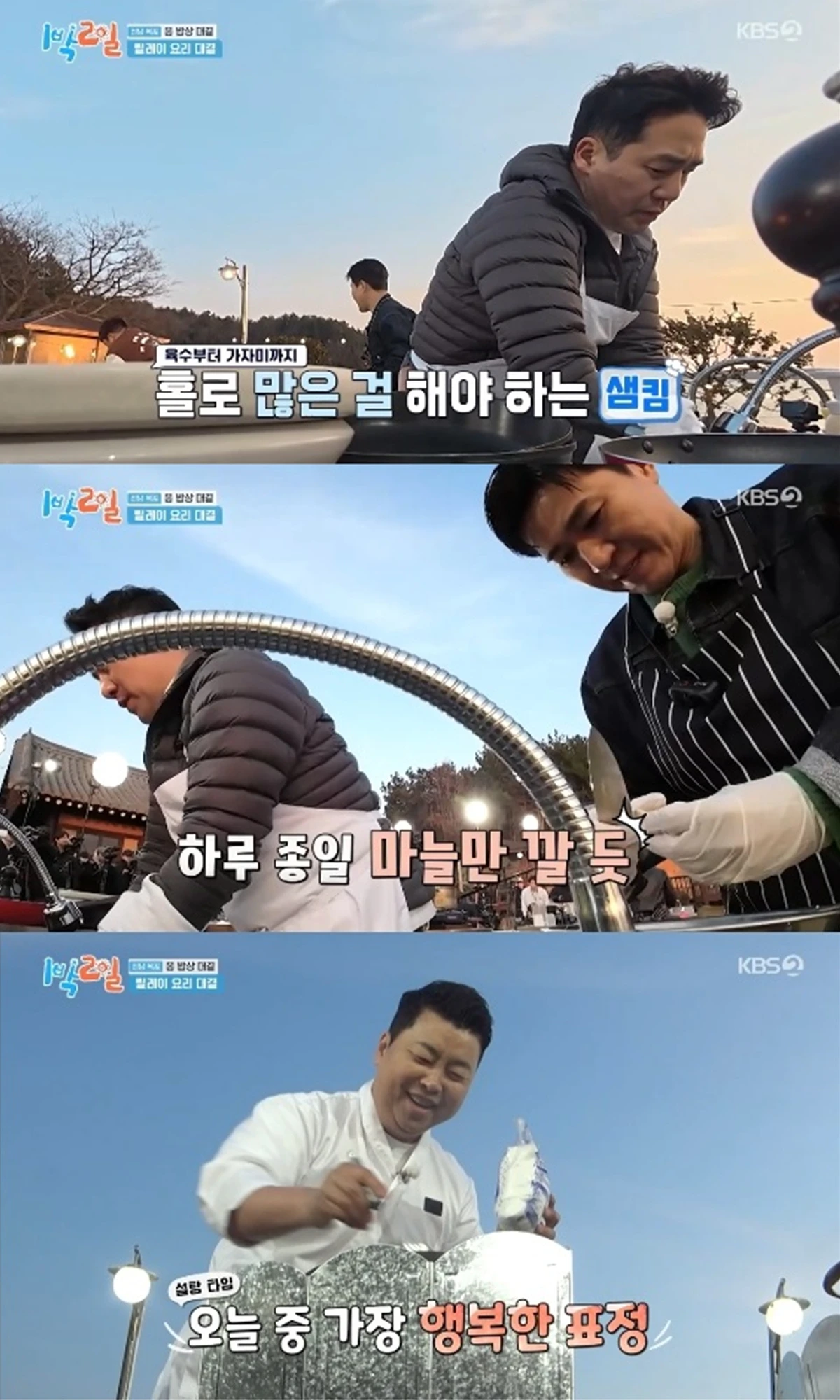 가자미를 구우려던 샘킴은 바람 때문에 약해진 버너 화력을 확인, 바지락 육수를 만들던 화구와 교체해 요리를 이어갔다.