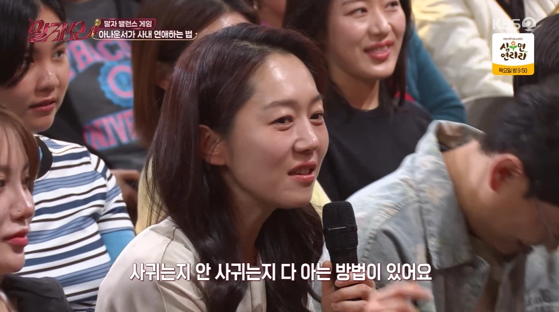 '직장인 특집'인 만큼 방청객들은 사내연애에 대한 생각을 밝혔다. 사내연애 목격담도 전해졌다. 특히 엄지인은 KBS 아나운서들의 사내연애를 많이 봤다고 털어놓았다.