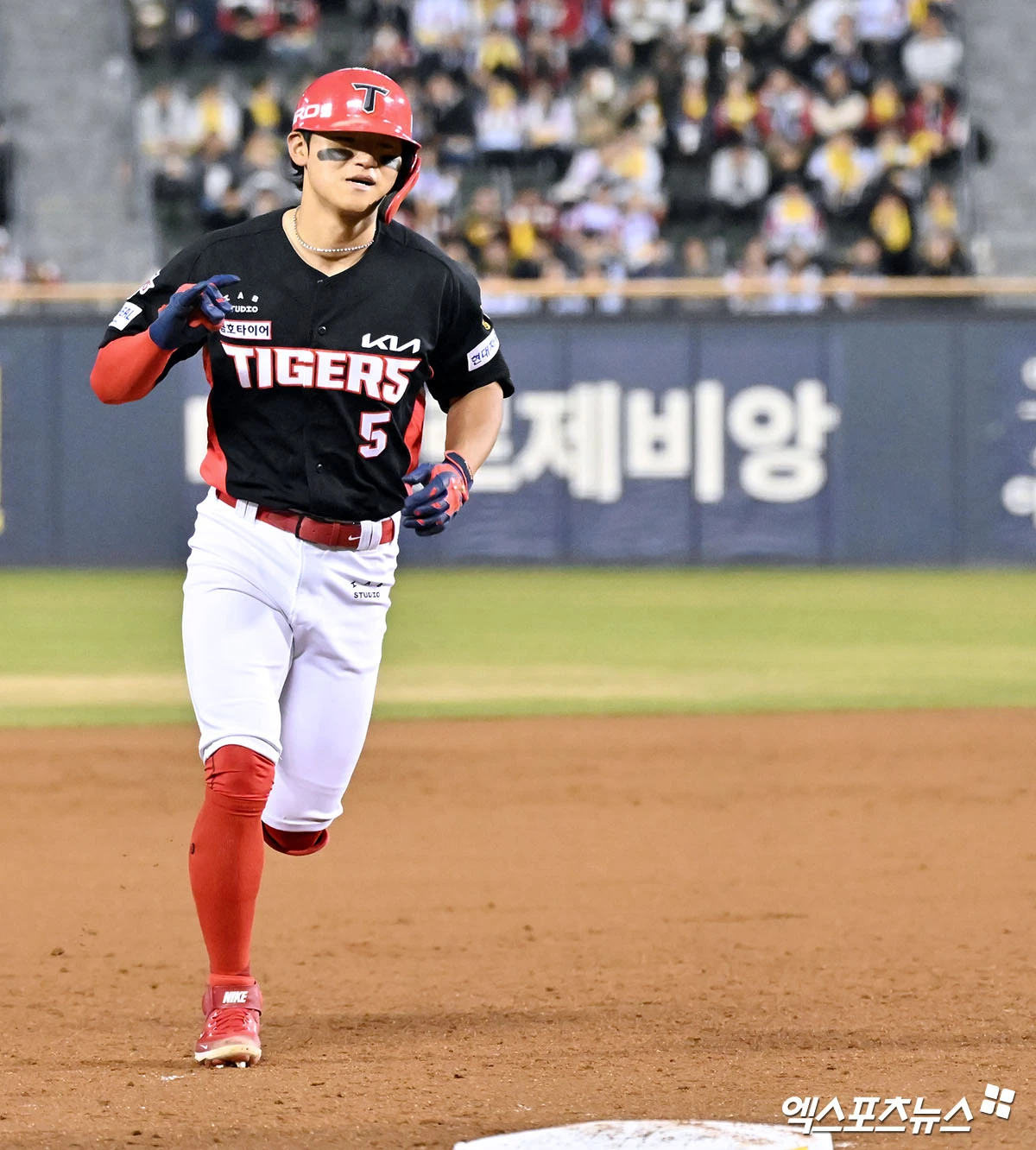 (엑스포츠뉴스 잠실, 김한준 기자) 31일 오후 서울 송파구 잠실야구장에서 열린 '2026 신한 SOL Bank KBO리그' KIA 타이거즈와 LG 트윈스의 경기, 2회초 2사 2루 KIA 김도영이 투런 홈런을 날린 후 기뻐하고 있다.