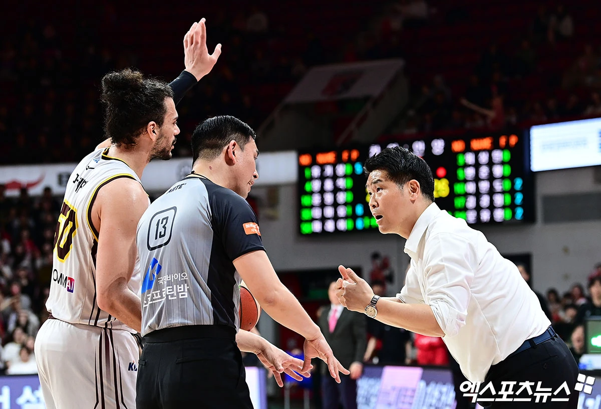 (엑스포츠뉴스 안양, 박지영 기자) 31일 오후 안양실내체육관에서 열린 '2026-2026 LG전자 프로농구' 안양 정관장과 창원 LG의 경기, LG 마레이와 조상현 감독이 파울 판정에 대해 어필하고 있다.