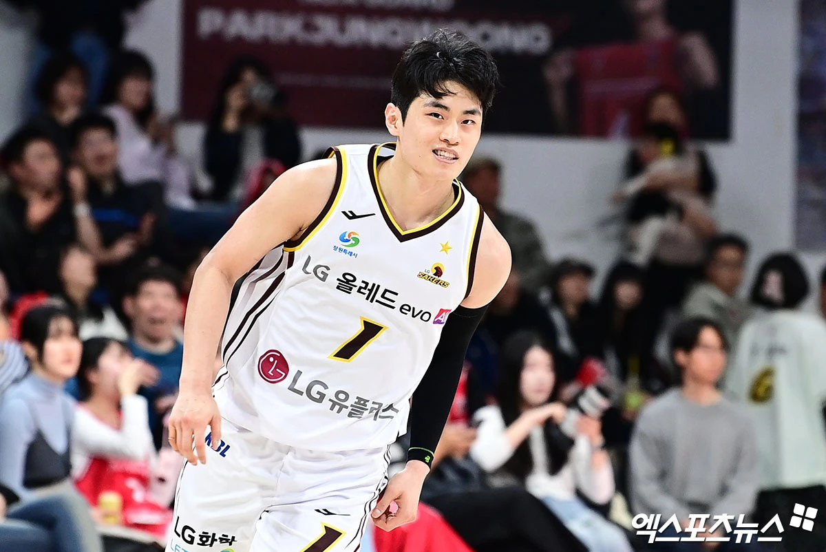 (엑스포츠뉴스 안양, 박지영 기자) 31일 오후 안양실내체육관에서 열린 '2026-2026 LG전자 프로농구' 안양 정관장과 창원 LG의 경기, LG 유기상이 슛을 성공시킨 뒤 미소짓고 있다.