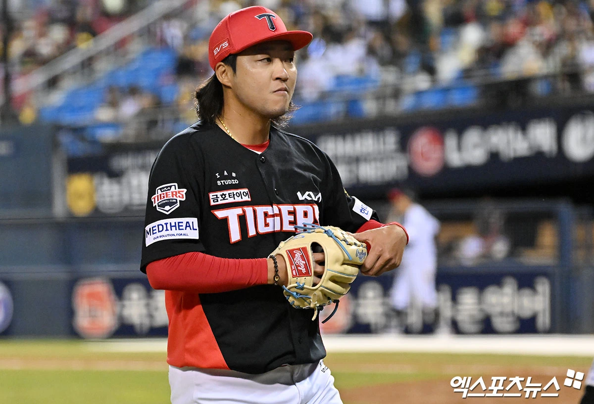 (엑스포츠뉴스 잠실, 김한준 기자) 31일 오후 서울 송파구 잠실야구장에서 열린 '2026 신한 SOL Bank KBO리그' KIA 타이거즈와 LG 트윈스의 경기, 8회말 수비를 마친 KIA 김범수가 더그아웃으로 향하고 있다.