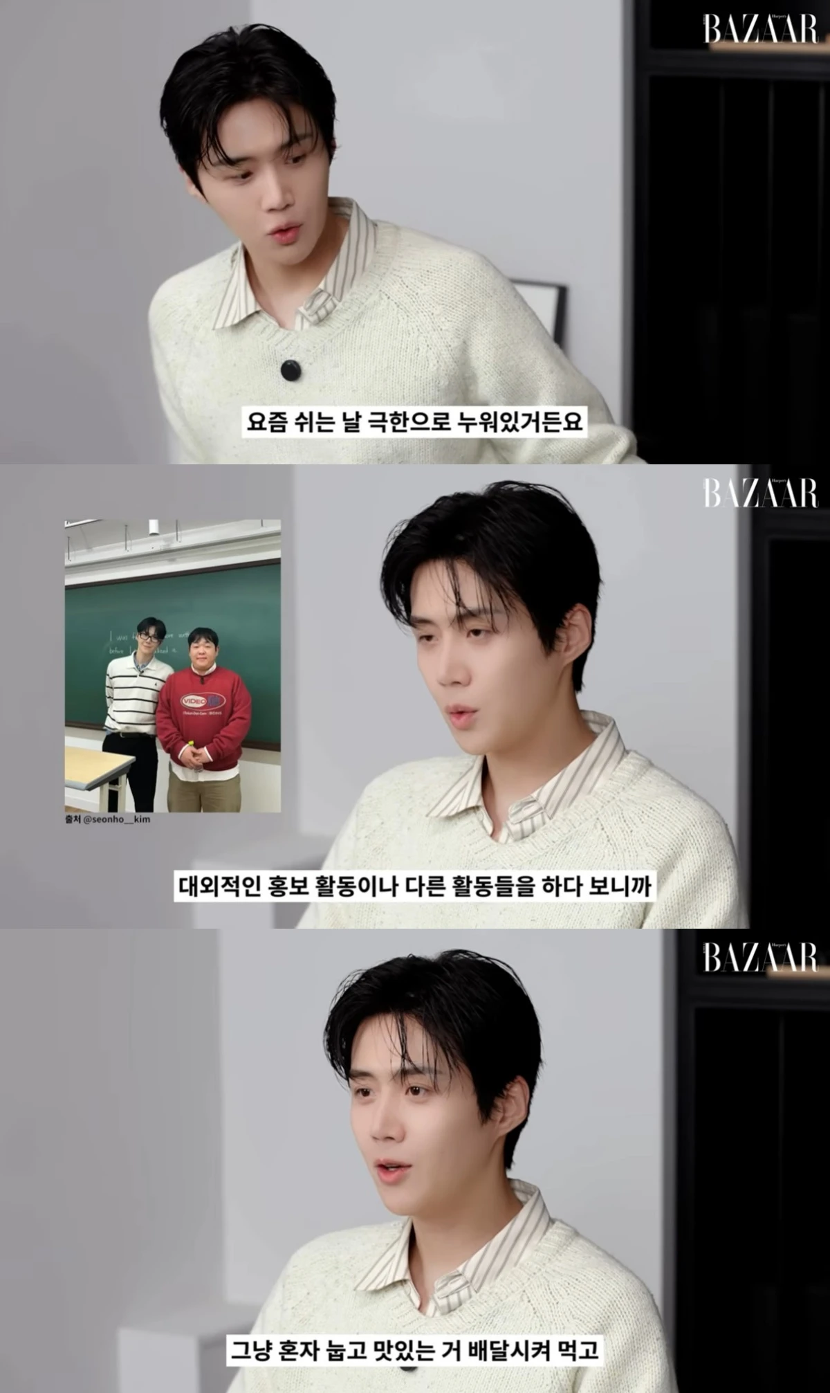 쉬는 날의 일상을 묻는 질문에도 김선호는 "요즘 쉬는 날 극한으로 누워있다. 다들 뭐하냐고 연락이 오면 천장 뷰를 다른 각도로 찍어서 보낸다"고 밝혔다.