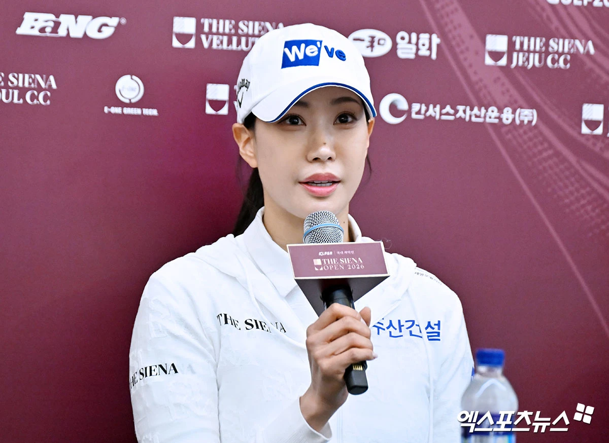 (엑스포츠뉴스 여주, 김한준 기자) 1일 오후 경기도 여주 더 시에나 벨루토 컨트리클럽(파72·6586야드)에서 열린 KLPGA '더 시에나 오픈 2026' 공식 기자회견, 유현주가 취재진의 질문에 답하고 있다.