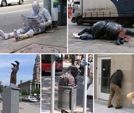 최근 각종 온라인 커뮤니티 게시판에는 미국의 '거리의 설치 예술가' 마크 젠킨스(Mark Jenkins. 미국)의 작품이 '사람인 줄 알았어'라는 제목으로 소개돼 화제다.