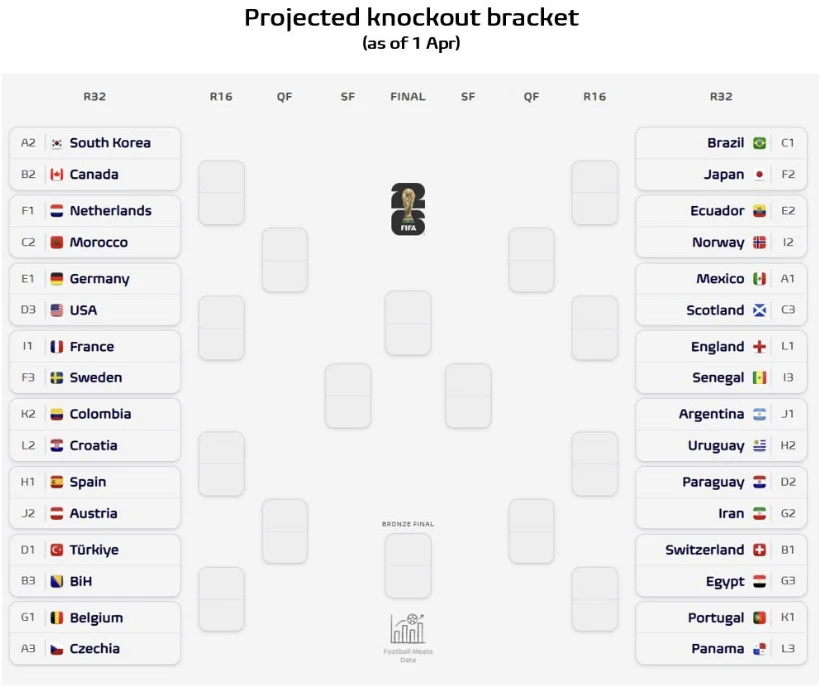 매체는 1일 유럽 예선 플레이오프 4경기와 대륙 간 플레이오프 2경기가 끝나 2026 월드컵 본선 진출국 48개국이 모두 가려진 뒤 32강 진출국을 콕 찍었다.