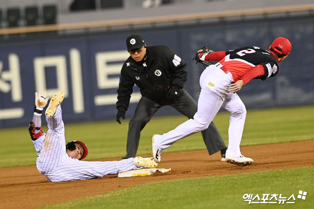 (엑스포츠뉴스 잠실, 고아라 기자) 1일 오후 서울 잠실야구장에서 열린 '2026 신한 SOL Bank KBO리그' KIA 타이거즈와 LG 트윈스의 경기, 7회말 KIA 박민이 LG 문성주를 태그아웃 시키고 있다.