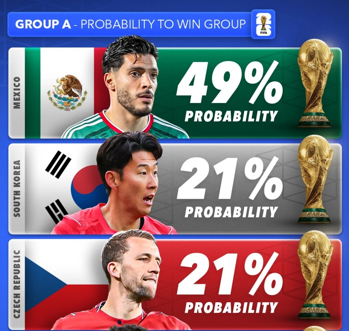 글로벌 축구 콘텐츠 매체 '스코어90'이 지난 1일(한국시간) 2026 국제축구연맹(FIFA) 북중미 월드컵(캐나다·미국·멕시코 공동개최) 출전국이 모두 확정된 가운데, 조별로 1위 확률을 예측했다.