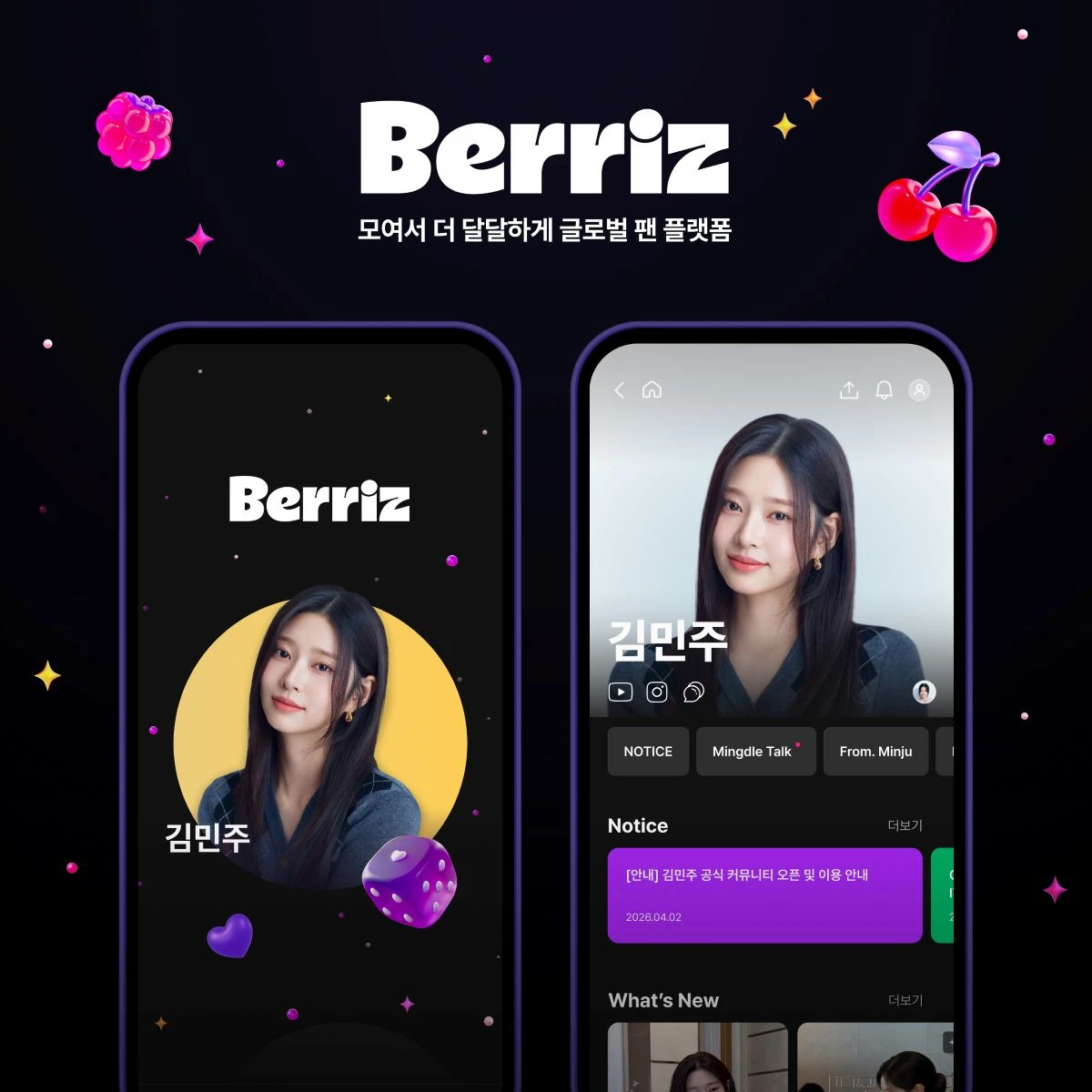 김민주는 베리즈를 통해 팬들과의 접점을 한층 넓히고, 보다 밀도 높은 소통을 이어간다. 팬덤명 ‘밍들레’는 배우의 애칭 ‘밍’과 일편단심의 상징 ‘민들레’를 결합한 이름으로, 서로에게 감사와 행복을 전하는 존재가 되자는 의미를 담고 있다.