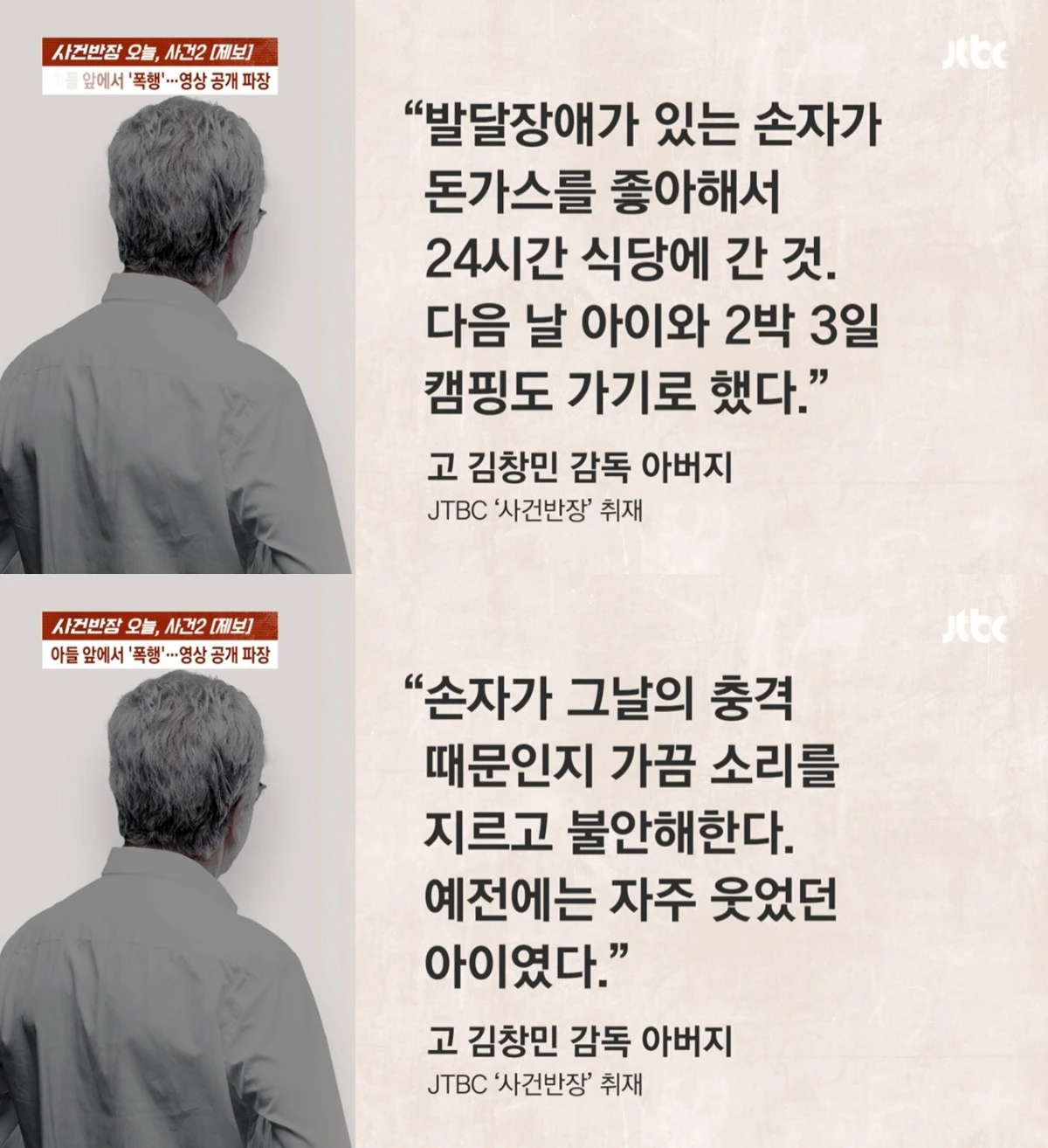 고인의 부친은 아들이 돈가스가 먹고 싶다는 손자의 말에 24시간 식당을 찾아 음식을 먹었다며 다음날 2박 3일 캠핑을 가기로 한 상황임을 밝혀 안타까움을 더했다.