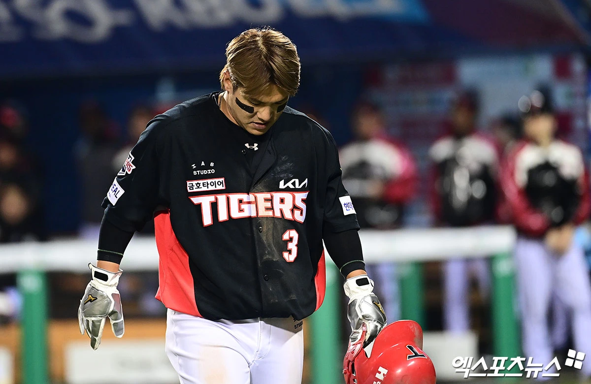 (엑스포츠뉴스 잠실, 박지영 기자) 2일 오후 서울 송파구 잠실야구장에서 열린 '2026 신한 SOL Bank KBO리그' KIA 타이거즈와 LG 트윈스의 경기, 4회초 1사 3루 KIA 데일의 내야 땅볼 때 3루주자 김선빈이 홈 쇄도를 시도했으나 LG 포수 박동원에게 태그아웃 당한 뒤 아쉬워하고 있다.