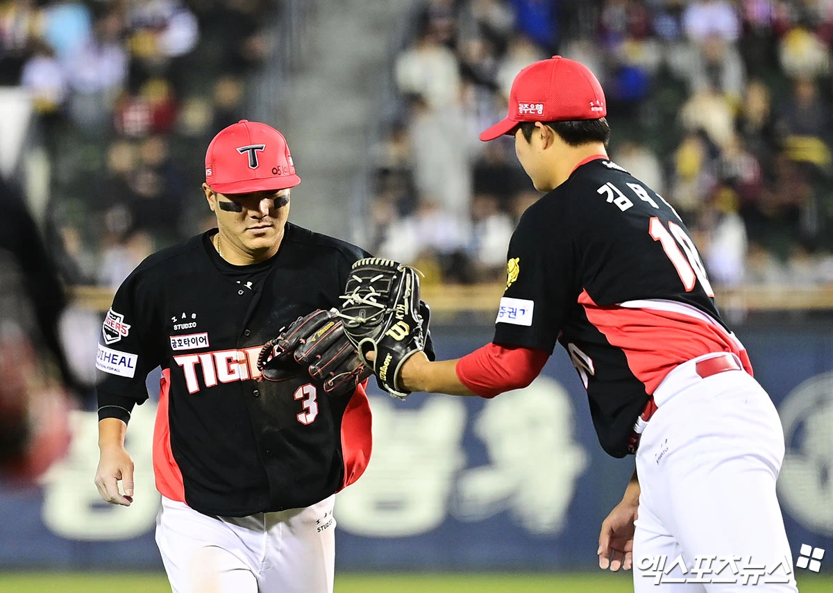 (엑스포츠뉴스 잠실, 박지영 기자) 2일 오후 서울 송파구 잠실야구장에서 열린 '2026 신한 SOL Bank KBO리그' KIA 타이거즈와 LG 트윈스의 경기, 5회말 종료 후 KIA 선발투수 김태형이 더그아웃으로 향하며 김선빈과 글러브를 맞대고 있다.