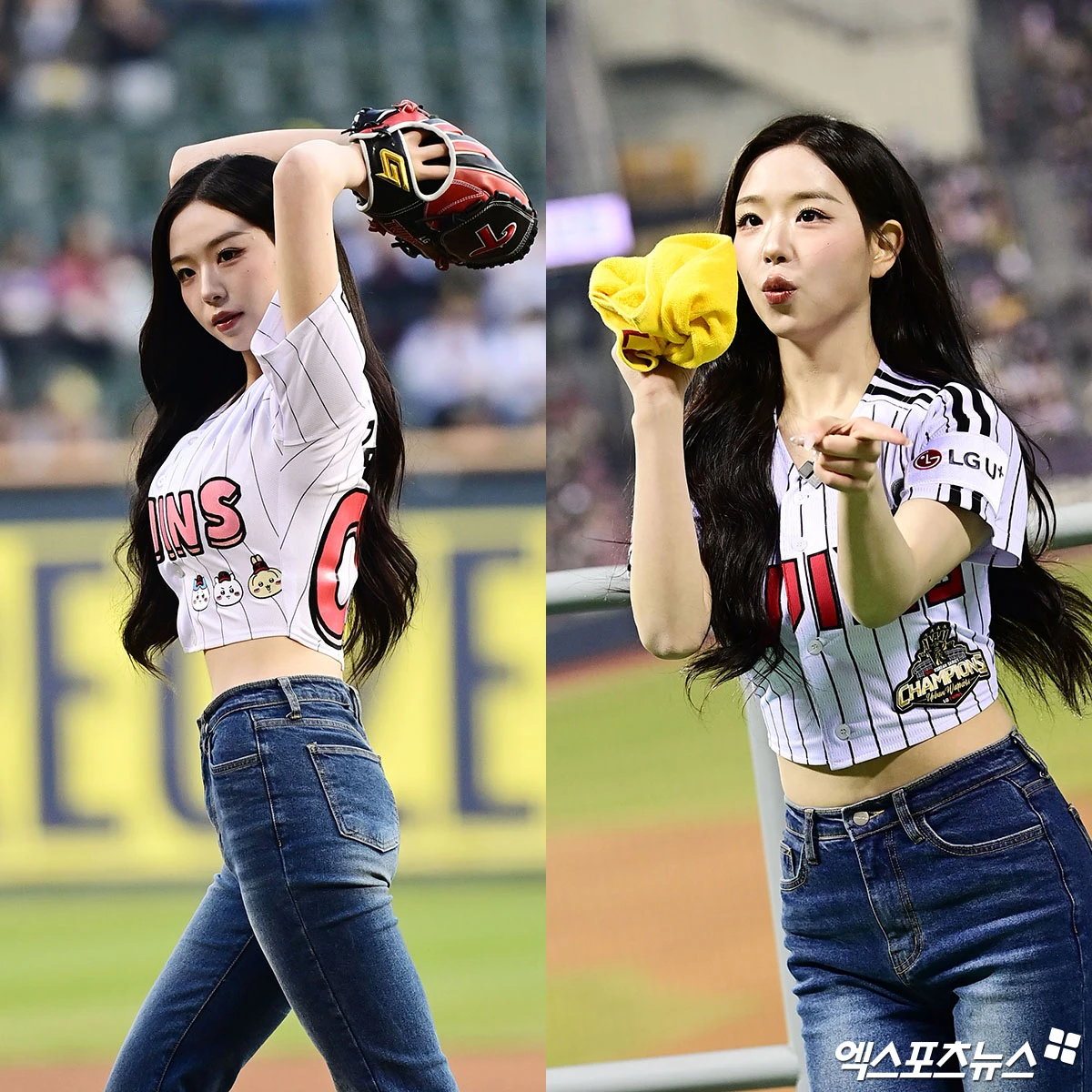 이날 경기에 앞서 시구에 나선 김채연은 '먼작귀' 콜라보 유니폼을 입고 그라운드에 등장해 야구팬들의 시선을 사로잡았다. 유니폼을 크롭 스타일로 연출해 가느다란 허리 라인을 강조했고, 세미 부츠컷 데님 팬츠를 선택해 활동성을 살렸다. 골반부터 무릎까지는 슬림하게 잡아주고 밑단은 자연스럽게 퍼지는 플레어 라인이 화이트 플랫폼 스니커즈와 만나 황금 비율을 완성했다.