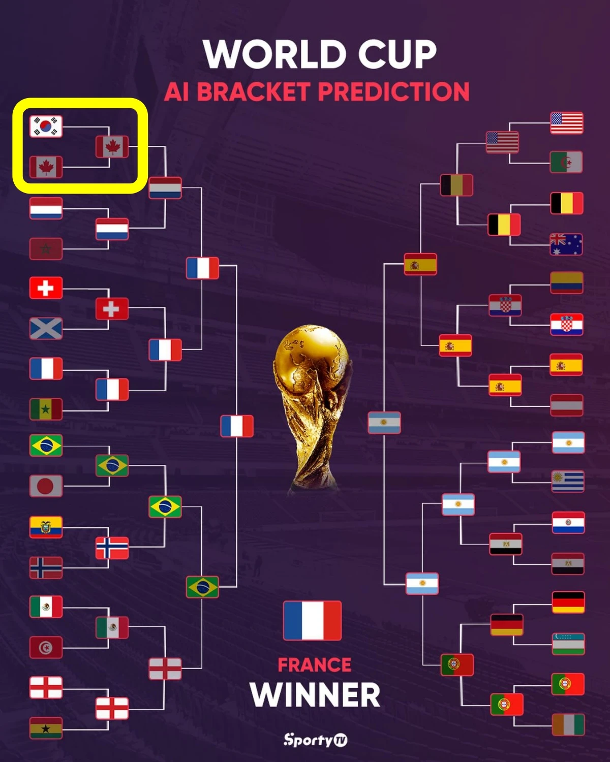 이러한 흐름에도 불구하고 AI는 한국과 캐나다의 32강 맞대결 승자로는 캐나다를 예측했다.