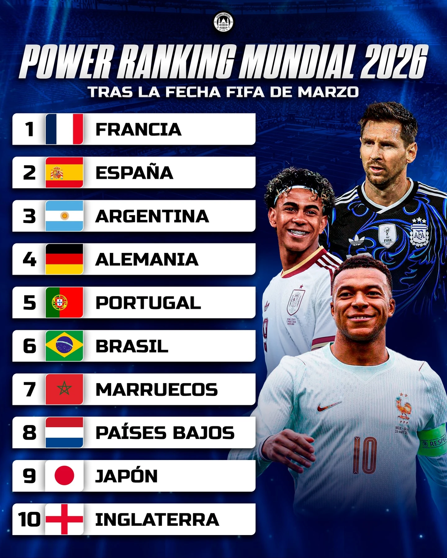 라틴아메리카 지역 스포츠 매체 '카테드랄 데포르티바'가 지난 2일(한국시간) 인스타그램을 통해 3월 A매치 이후 2026 국제축구연맹(FIFA) 북중미 월드컵(캐나다·미국·멕시코 공동개최) 파워 랭킹 상위 10위를 공개했다.