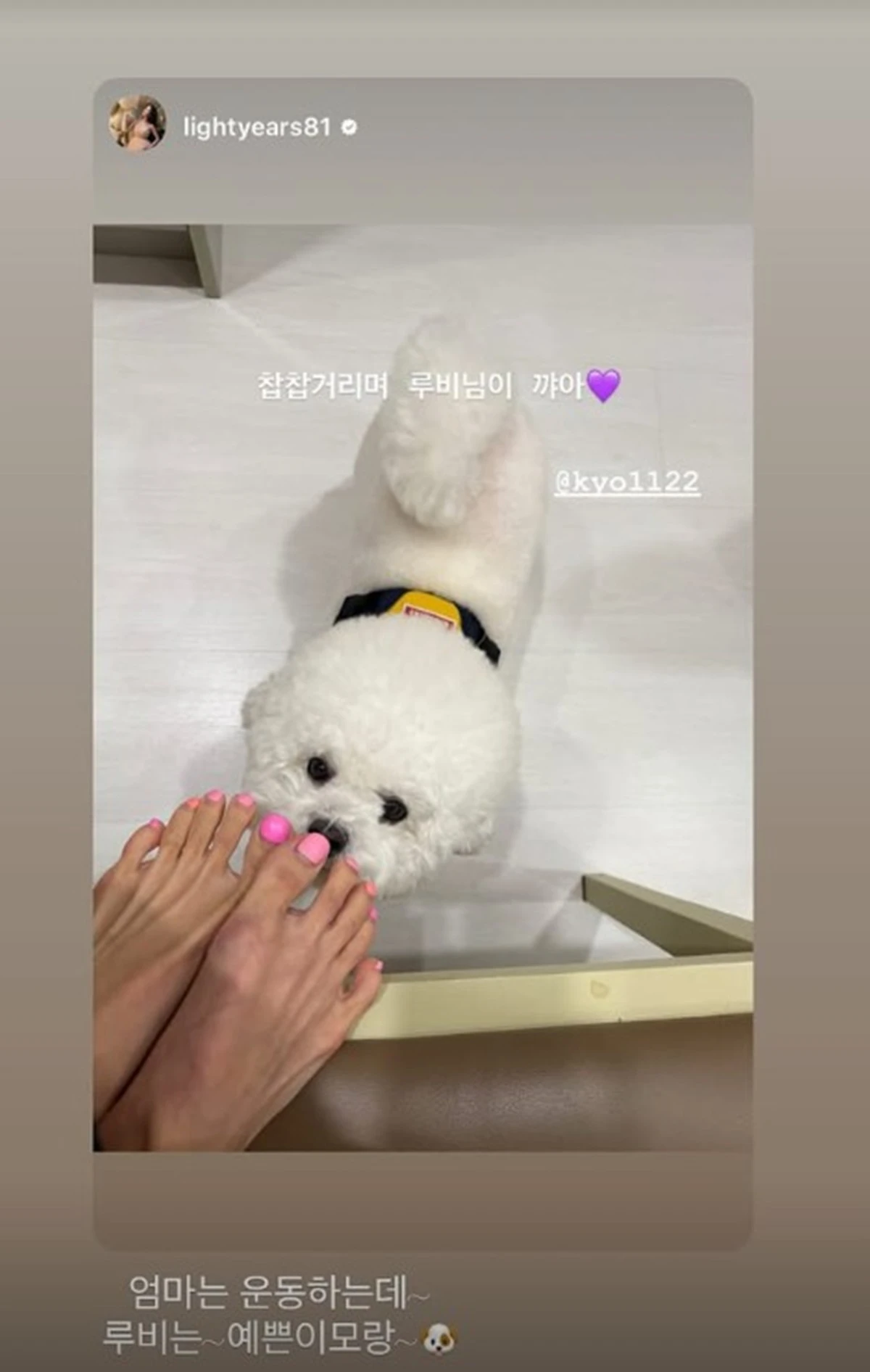 분홍색 패디큐어가 돋보이는 조여정의 발이 담긴 사진에는 송혜교의 반려견 루비가 조여정을 올려다보는 모습이 포착돼 귀여운 매력을 자랑했다.