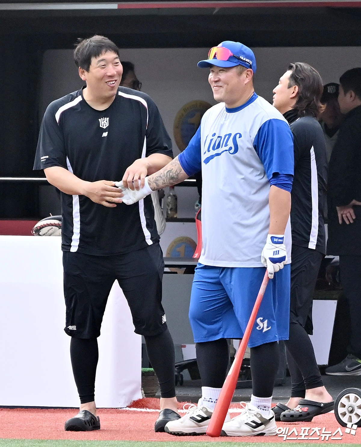 (엑스포츠뉴스 수원, 김한준 기자) 3일 오후 수원KT위즈파크에서 열리는 '2026 신한 SOL Bank KBO리그' 삼성 라이온즈와 KT 위즈의 경기, KT 김현수와 삼성 최형우가 인사를 나누고 있다.