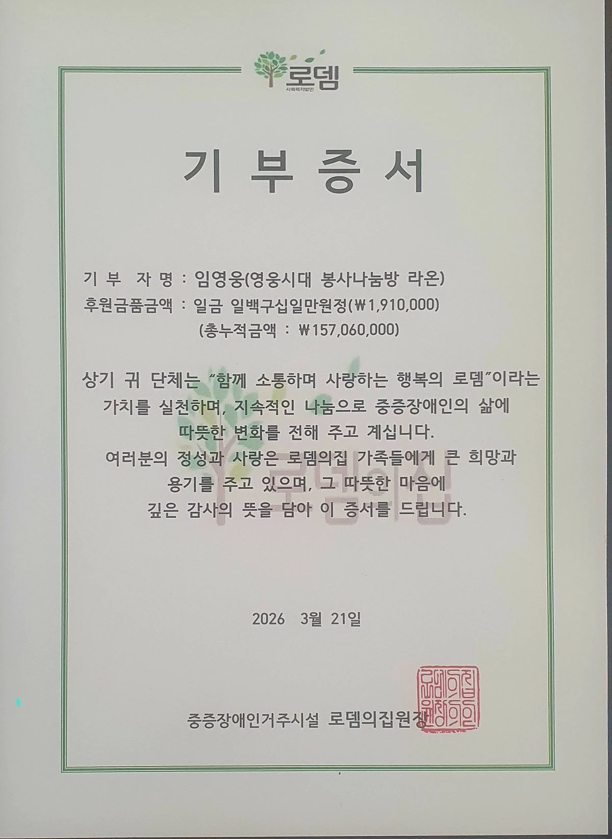 '로뎀의집' 원장은 "우리 원생들은 '라온'이 오는 날만 손꼽아 기다린다"라며 "매달 새로운 식단과 정성 어린 간식을 챙겨주시는 '영웅시대' 분들께 진심으로 감사드린다"라고 말했다.