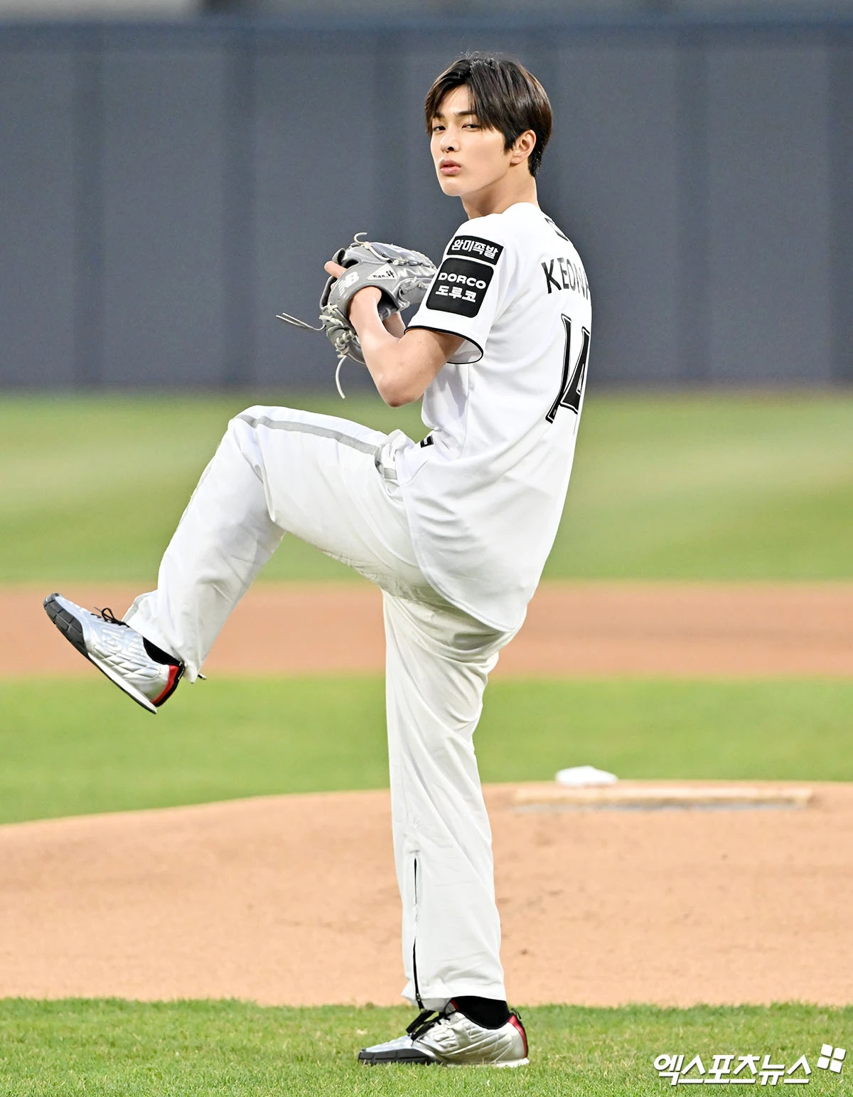 (엑스포츠뉴스 수원, 김한준 기자) 3일 오후 수원KT위즈파크에서 열린 '2026 신한 SOL Bank KBO리그' 삼성 라이온즈와 KT 위즈의 경기, 경기 전 그룹 코르티스 건호가 시구에 임하고 있다.